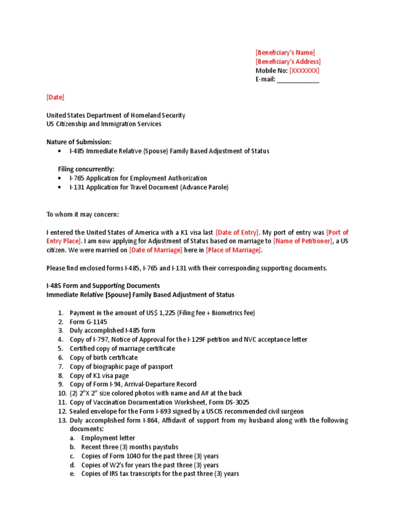 Beautiful Form I 485 Checklist Models Form Ideas from www.flaminke.com Citizen spouse of the beneficiary. We added signed petition letters explaining what documents are in the package and how it is organized. I am an applicant under k1 (fiance) visa status currently residing at 23654 chippendale ave n unit #65 lakeville, tx 65358 usa. A cover letter has two (2) benefits. It's just a basic structure that will not give you too much trouble. When creating an official or business letter, discussion design and format is key to making a good impression. First, it is a nice document for a uscis officer to receive when they open a packet. Use this sample cover letter as a guide.