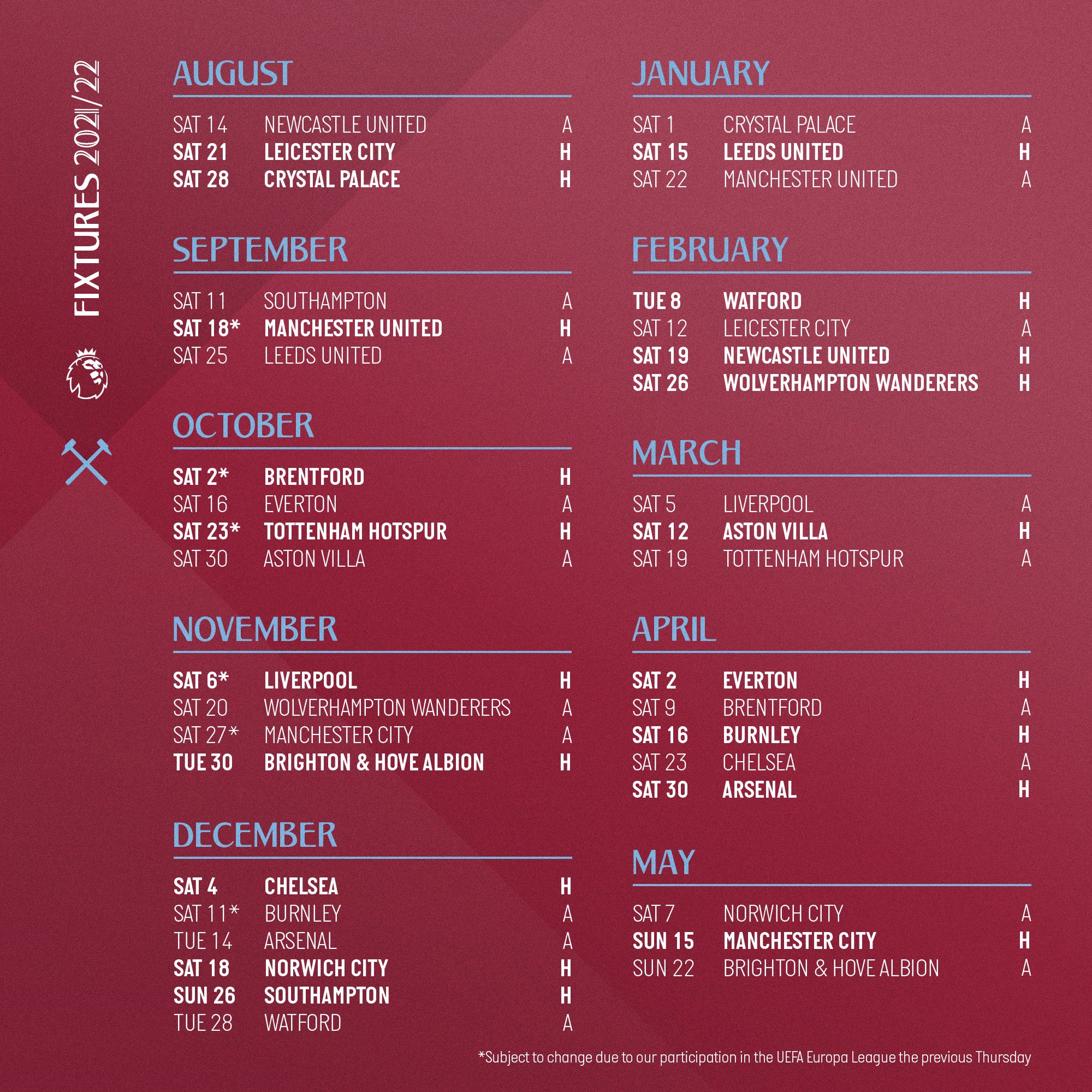 โปรแกรมพรีเมียร์ ลีก ทั้งหมด 380 นัด จาก 20 ทีมเข้าแข่งขัน ในฤดูกาล 2021/22 จะประกาศอย่างเป็นทางการในวันพุธที่ 16 มิถุนายนนี้ ในเวลา 15.